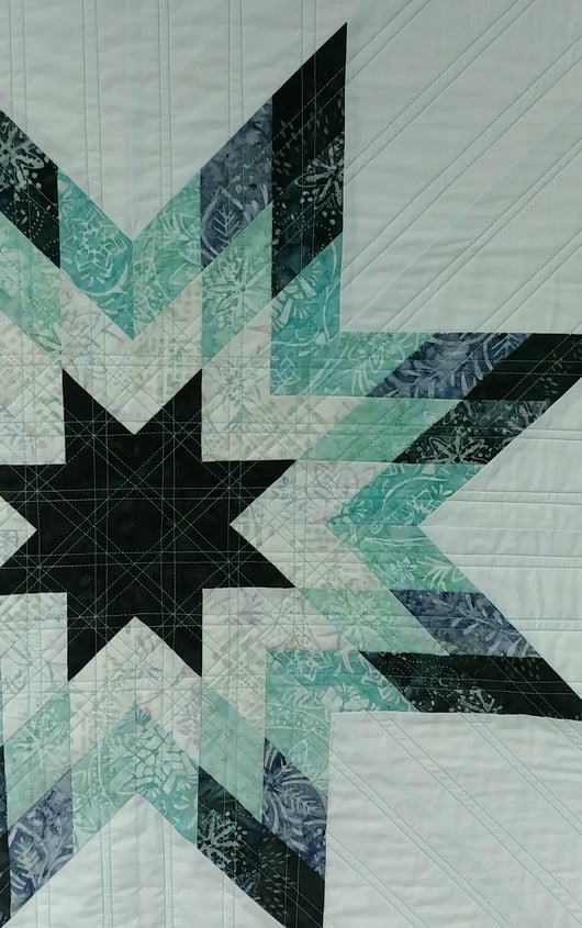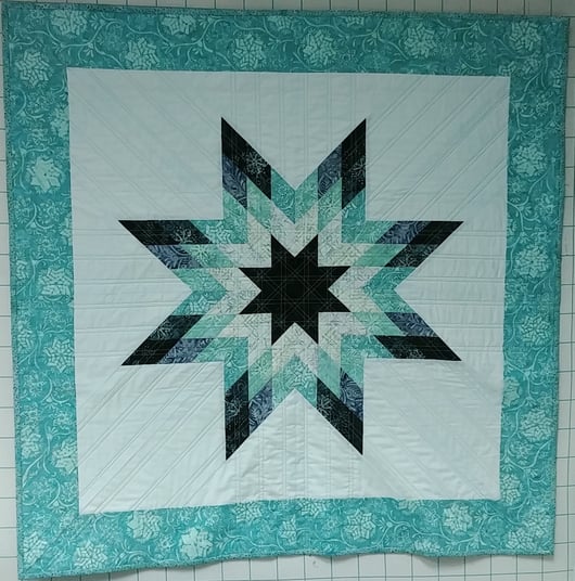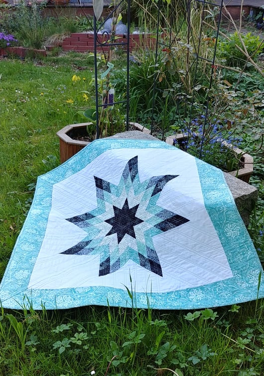 Und dann konnte ich auch endlich mal wieder quilten! So ist nun mein Lone Star von Judy Niemeyer (Quiltworx) fertig geworden, den ich im Februar in der Foundation Paper Piecing-Technik im Retreat in den Niederlanden genäht hatte. Die Anleitung heißt "Star Baby" und ich habe den Quilt in zarten Mint-Tönen genäht.