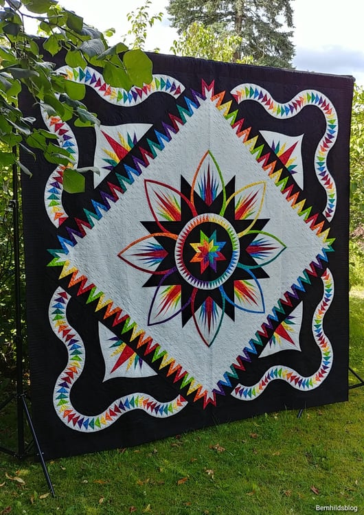 Vor etwa drei Jahren habe ich die Anleitung für diesen Quilt zum ersten Mal gesehen und wollte ihn unbedingt nähen. Die Regenbogenfarben haben mich so sehr begeistert, da musste dieses Projekt umgehend auf meine ToDo-Liste!. Und endlich, vor ca. einem Jahr, hatte ich dann im Urlaub das erste Mal etwas Zeit, um mit dem Quilt zu beginnen. Nach einigen größeren Schaffenspausen kann ich ihn nun komplett fertig präsentieren.