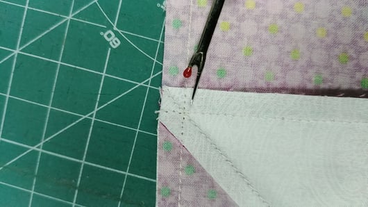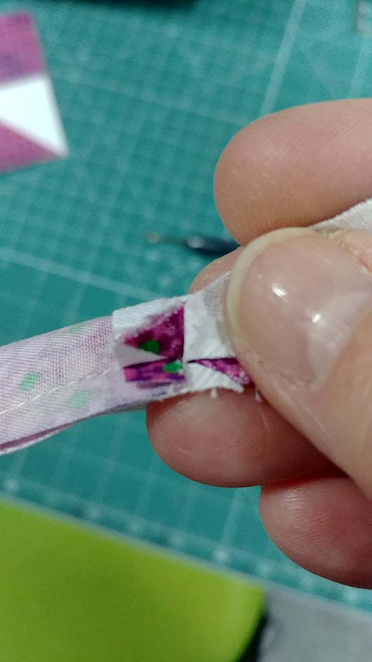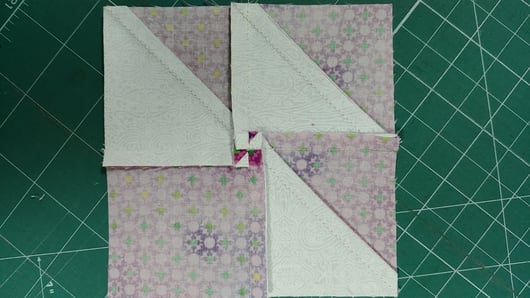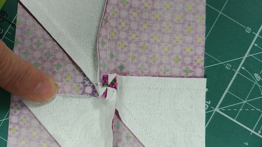 Nach dem Entfernen der Stiche kann ich die Nahtzugabe so öffnen, dass auf der Rückseite ein kleines Fourpatch entsteht. Dann bügele ich die Nahtzugabe so, dass es auf der Rückseite wie eine Windmühle aussieht.