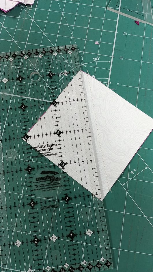 Bügele die Nahtzugaben jeweils zur farbigen Seite und im Anschluss musst du die Quadrate nun noch auf das gewünschte Maß zuschneiden ("trimmen"). Dafür benutze ich den Half Square Triangle Ruler von BlocLoc. Den gibt es in verschiedenen Größen (z.B. 4 1/2", 6 1/2" oder 8 1/2") und in einer Größe sogar metrisch, nämlich in 15 cm x 15 cm!
