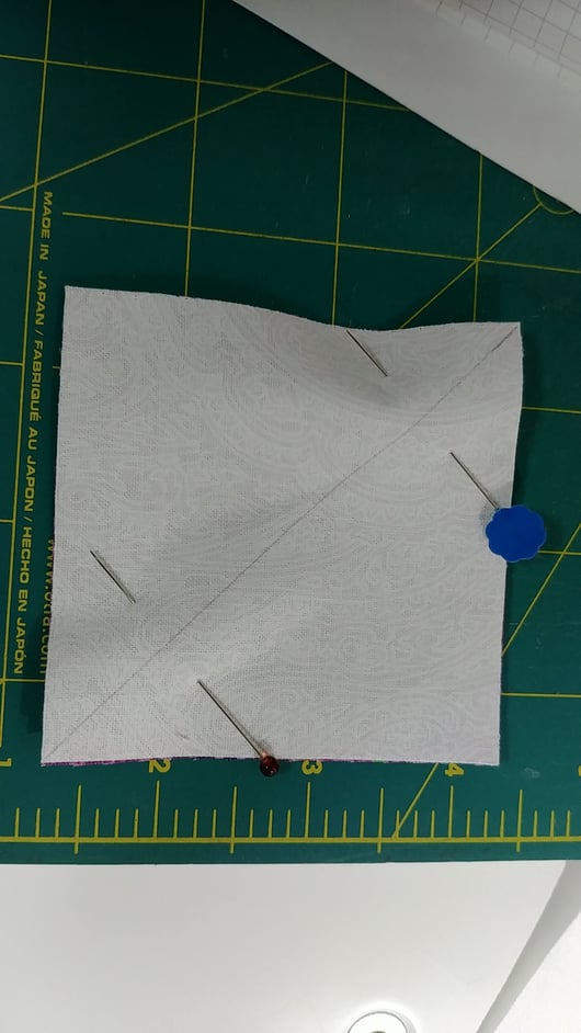 Dann steckst du je ein helles Quadrat mit einem farbigen rechts auf rechts übereinander und nähst beidseitig der eingezeichneten Diagonalen mit einem Abstand in der Breite der Nahtzugabe (1/4").