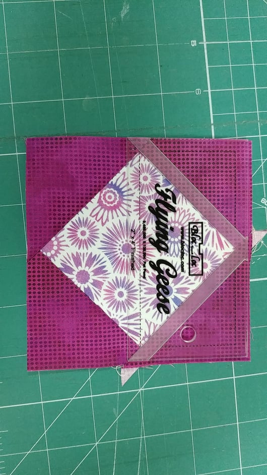 Nach der Fertigstellung musst du dieses Square in a Square nun noch auf die gewünschte Größe trimmen. Dazu nimmst du ein Flying Geese-Lineal von BlocLoc zu Hilfe.