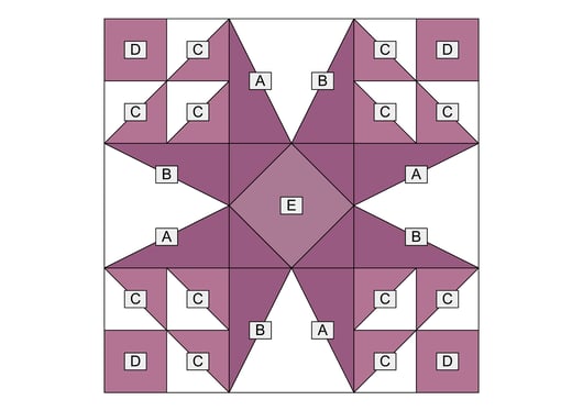Dazu schneidest du die beiden größeren, gleichfarbigen Quadrate E diagonal durch, so dass du vier Dreiecke erhältst. Je zwei dieser Dreiecke nähst du an die gegenüberliegenden Seiten des kleineren Quadrates E.