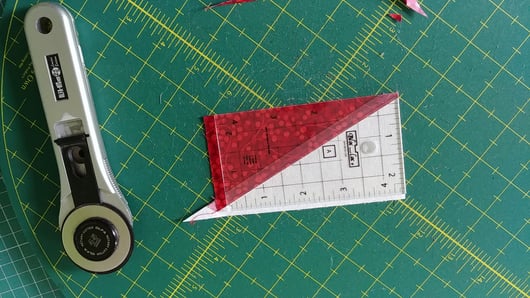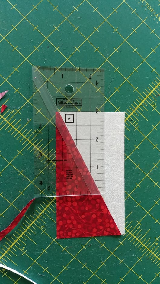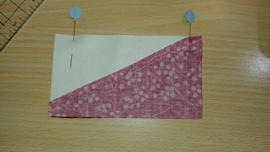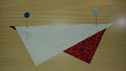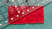 Sortiere die Stoffe nach Hintergrund- und Akzentstoff und nähe die beiden Teile an der Diagonalen so zusammen, dass an beiden Seiten Spitzen überstehen. Der Abstand vom Kreuzungspunkt der beiden übereinanderliegenden Stoffe zur Nahtzugabenkante sollte mindestens 1/4 Inch betragen.