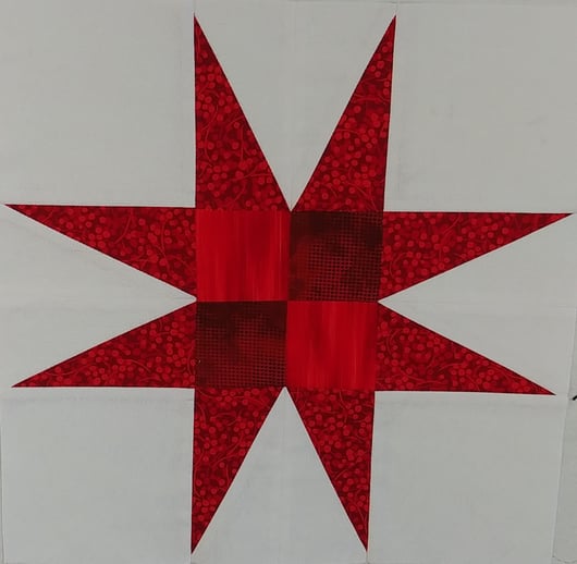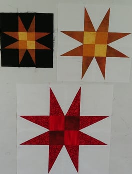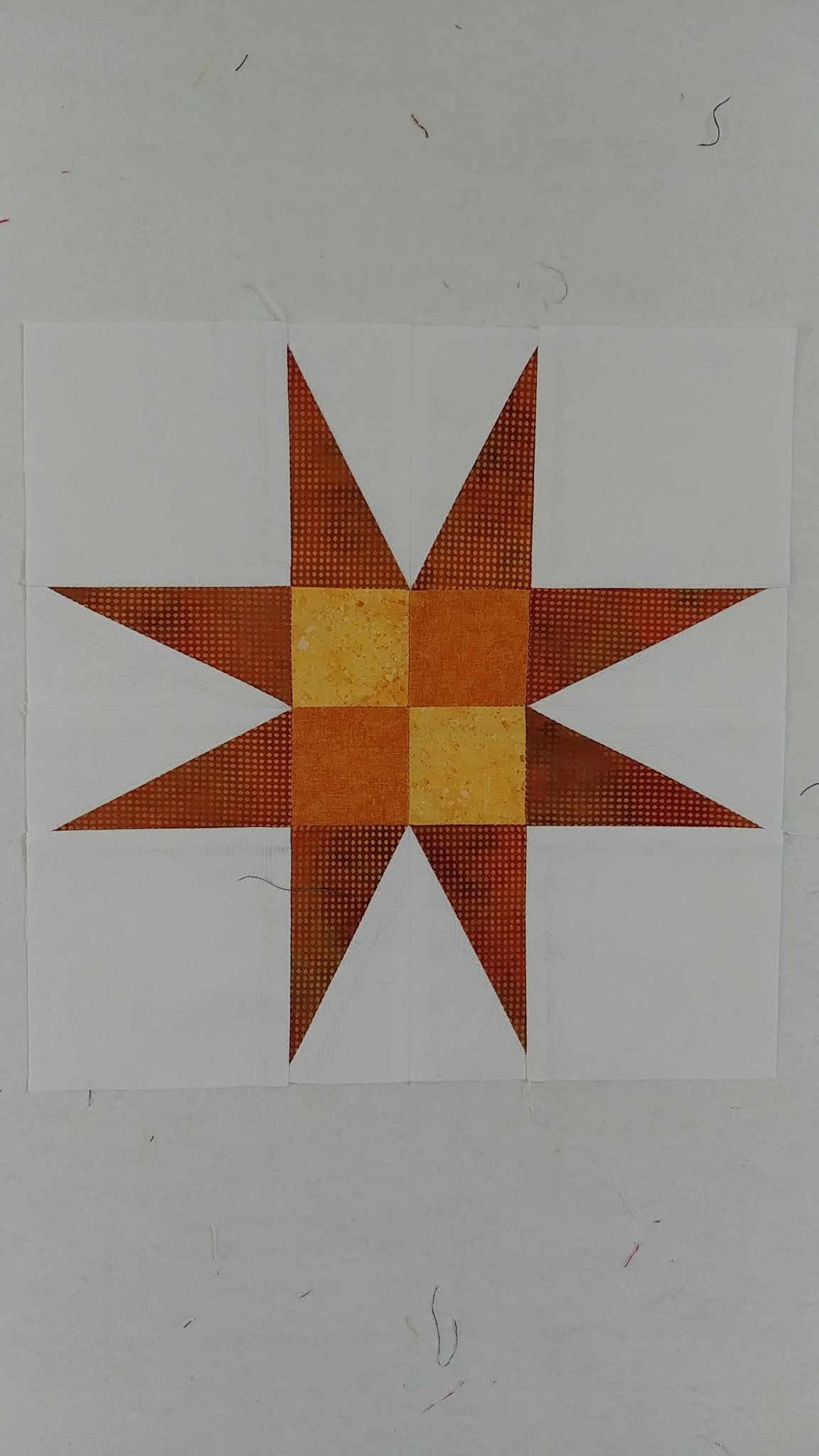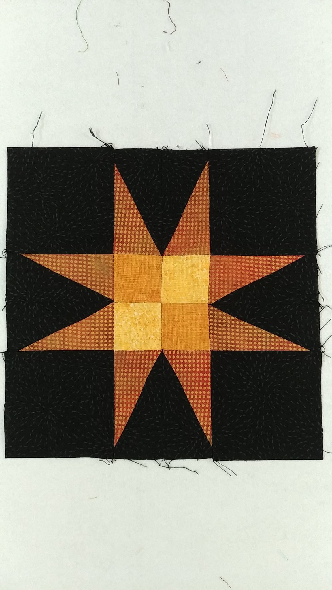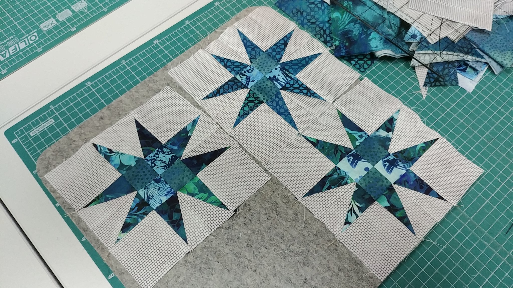 Für den ersten Block habe ich außer dem Hintergrundstoff drei verschiedene Stoffe verwendet, einen für die Spitzen und zwei für die Mitte.
