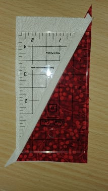 Das Lineal B aus dem HRT-Set legst du nun so auf dein zusammengenähtes Rechteck, dass beide Teile hochkant vor dir liegen. Wieder beachten: