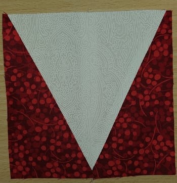 Für die Segmente B schneidest du nochmal je zwei Rechtecke aus Hintergrund- und Akzentstoff zu und wiederholst die oben beschriebenen Schritte, wobei du die Rechtecke jetzt von unten links nach oben rechts durchschneidest. Wieder zusammennähen, aber diesmal zum Hintergrundstoff bügeln.