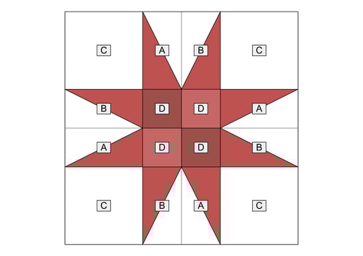 Schneide anhand der obigen Tabelle die restlichen Stoffe für den Block zu, nähe dann zu Reihen zusammen und die Reihen wiederum zum Block.